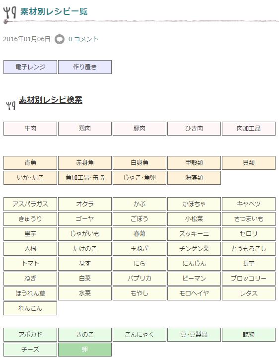 ブログ上部のメニューバーの、「レシピ一覧」をクリックしていただくと、素材別に選べるようになっています。